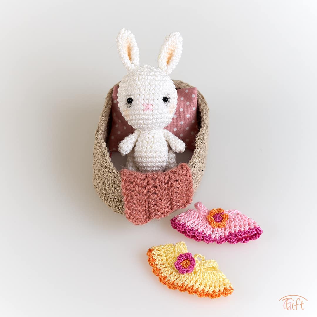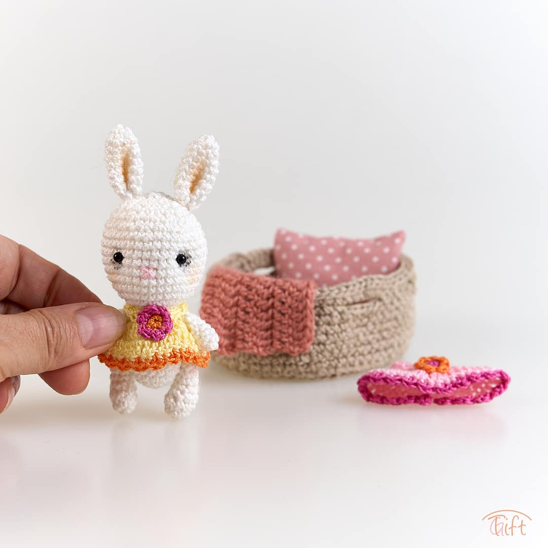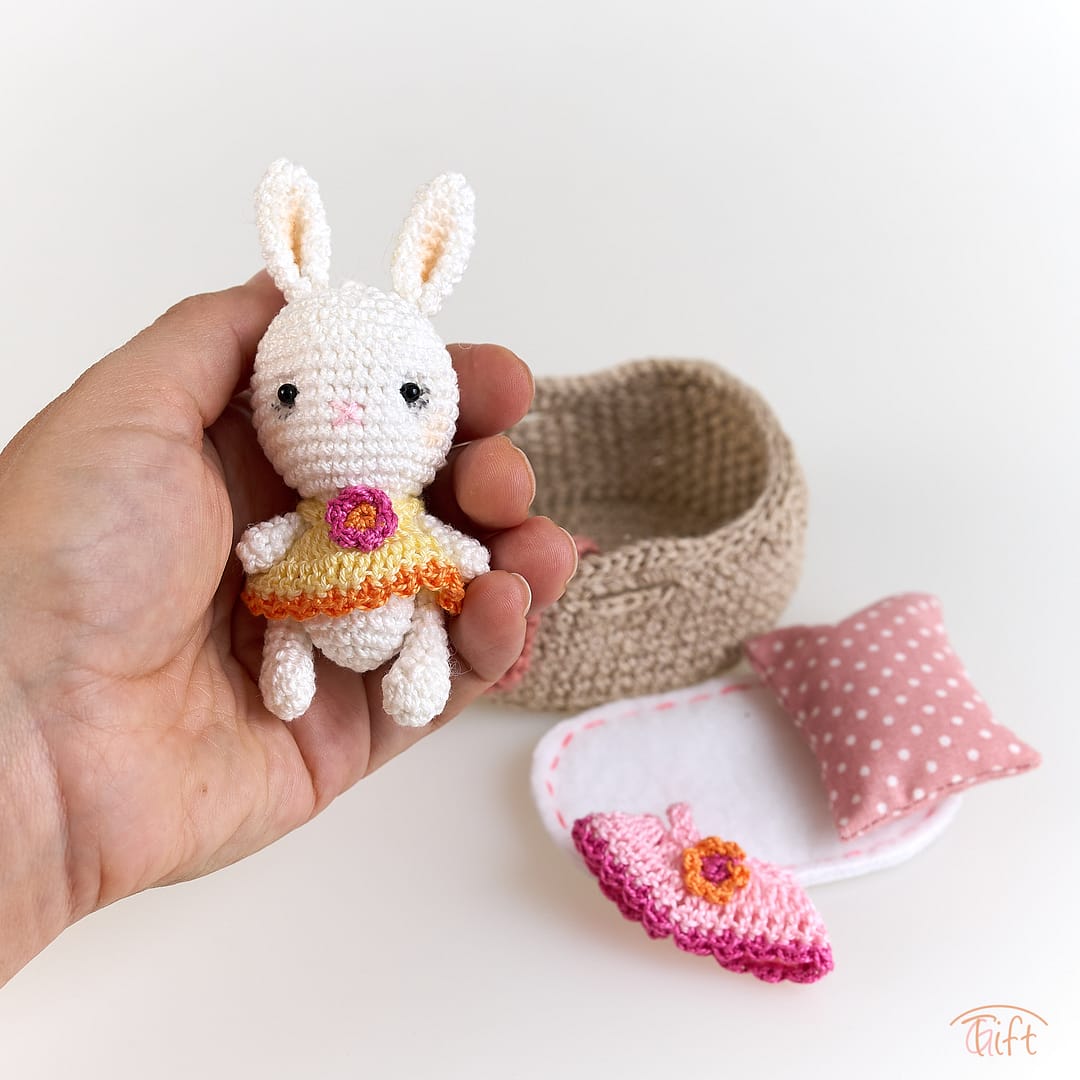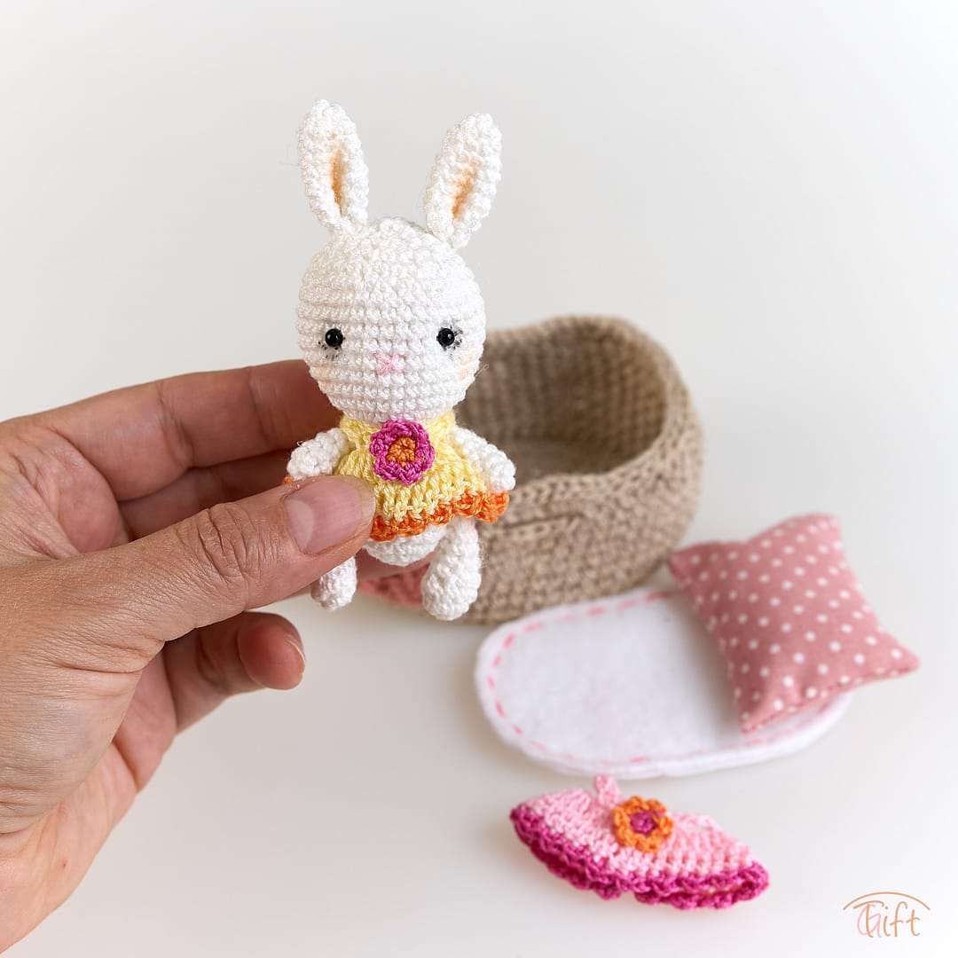Zvieratko je uháčkované z jemnej bavlnenej priadze, s vyšívanou tváričkou. Je oblečené v roztomilých ručne robených šatôčkach. Všetko starostlivo vyrobené ručne, s dôrazom na detail a láskou k miniatúram.