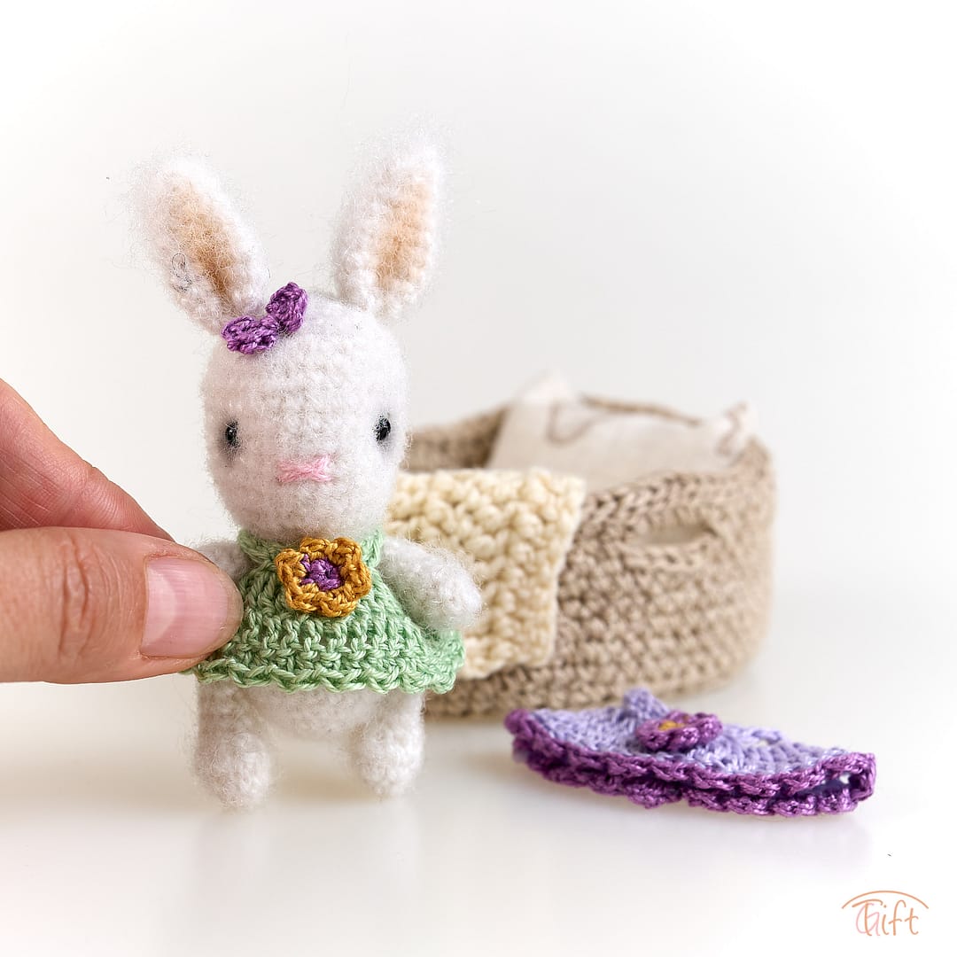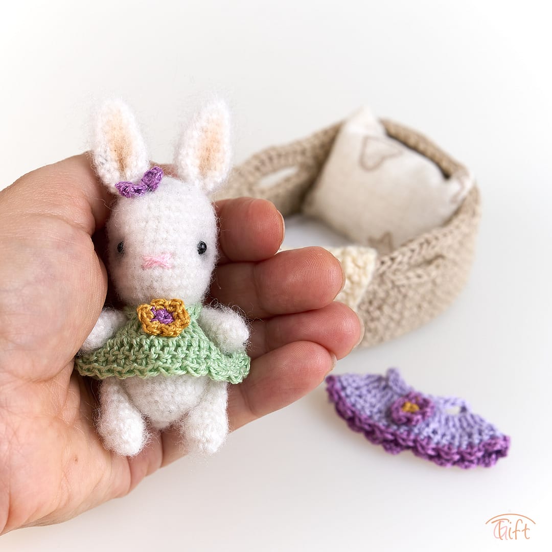 Zvieratko je uháčkované z jemnej zmesi akrylu a vlny, s vyšívanou tváričkou a malou mašločkou na hlavičke. Je oblečené v roztomilých ručne robených šatôčkach. Všetko starostlivo vyrobené ručne, s dôrazom na detail a láskou k miniatúram.